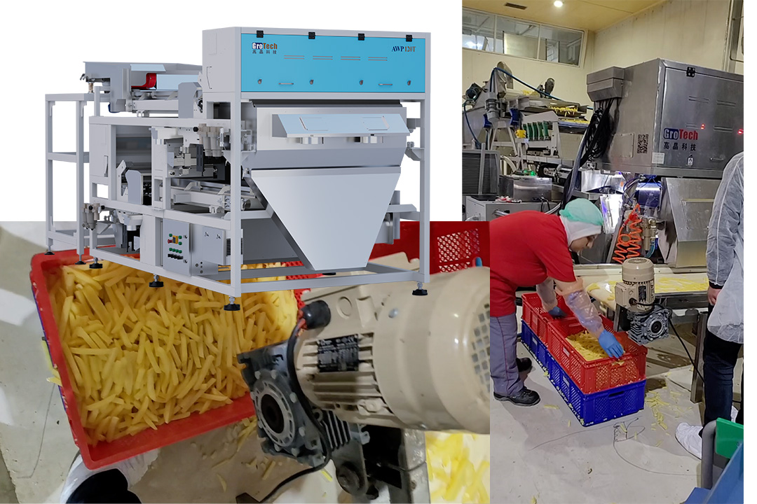 In the modern food processing industry, especially in French fries production, color sorting technology has become a crucial step in ensuring product quality and production efficiency. Traditional manual sorting is not only time-consuming and labor-intensive but also prone to errors, making it difficult to ensure consistency in color and appearance for every French fry. With the advancement of technology, more and more manufacturers are turning to automated color sorting equipment, particularly artificial intelligence-based sorters. GroTech’s AW120T color sorter is a leader in this field, utilizing advanced imaging and deep learning algorithms to achieve high-efficiency, precise sorting.